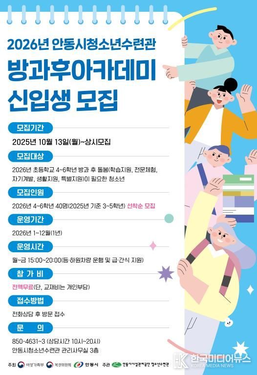 [ 한국미디어뉴스 이보영 기자 ] 안동시시설관리공단이 운영하는 청소년수련관 방과후아카데미가 오는 10월 13일부터 2026년도 신입생 모집을 시작한다.