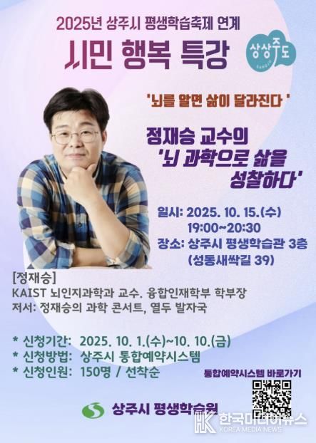 [ 한국미디어뉴스 이보영 기자 ] 상주시 평생학습원은 2025. 10. 15. 오후 7시부터 8시30분까지 상주시 평생학습관 3층 강당에서 뇌과학자이자 미래학자인 정재승 KAIST 교수를 초청하여 특별 강연을 진행한다.