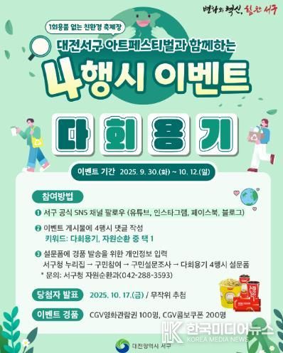 [ 한국미디어뉴스 이보영 기자 ] 대전 서구는 오는 10월 10일부터 12일까지 개최되는 ‘2025년 대전 서구 아트페스티벌’을 일회용품 없는 친환경 축제로 운영한다.