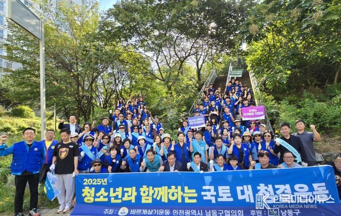 [ 한국미디어뉴스 김만길 기자 ] 인천시 남동구 바르게살기운동 남동구협의회는 100여 명의 회원 및 주니어클럽 봉사단체 초․중․고 학생들과 구월1동 아시아드 근린공원 및 인근 상가 주변에서 ‘국토대청결운동’을 실시했다고 1일 밝혔다.