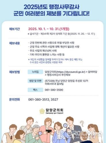 [ 한국미디어뉴스 이종철 기자 ] 담양군의회는 2025년 행정사무감사를 앞두고 ‘행정사무감사 주민제보’ 접수를 첫 시행 한다고 밝혔다.