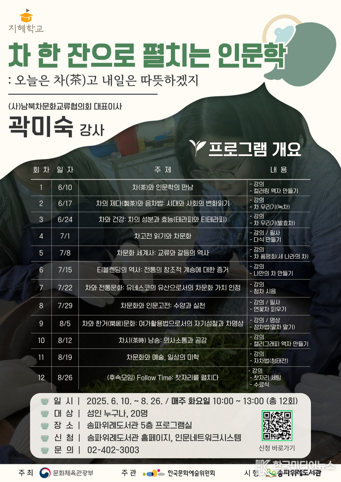 [ 한국미디어뉴스 이원영 기자 ] (재)송파문화재단(대표이사 이동근) 소속 송파위례도서관에서 지난 6월부터 8월까지 운영한 지혜학교「차 한 잔으로 이어진 인문학: 오늘은 차(茶)고 내일은 따뜻하겠지」프로그램이 성황리에 마무리되었다고 1일 밝혔다.