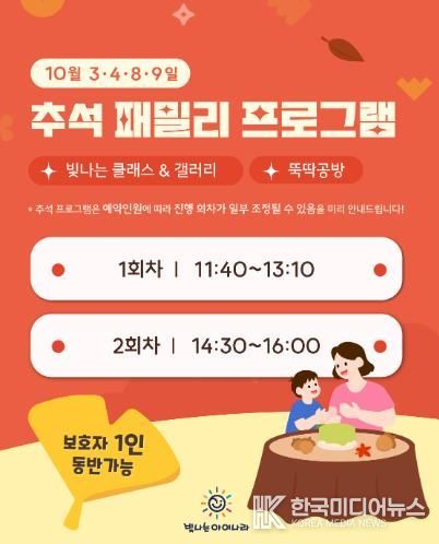 연휴 특별 가족 프로그램은 ‘가을 단풍 숲 작은 음악회’를 주제로 3·4·8·9일 진행하며 ▲빛나는 클래스&빛의 갤러리 ▲동화공작소 ▲뚝딱공방 ▲물감공방 등을 체험할 수 있다.