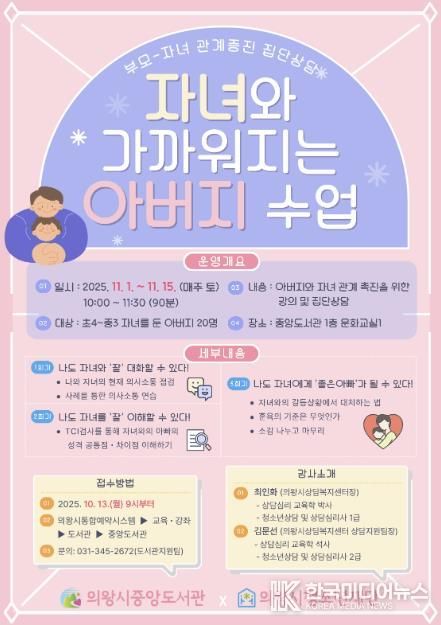 신청은 10월 13일 오전 9시부터 의왕시 통합예약시스템을 통해 선착순으로 진행되며, 관내 사춘기 자녀(초등학교 4학년~중학교 3학년)를 둔 아버지라면 누구나 프로그램에 참여할 수 있다.