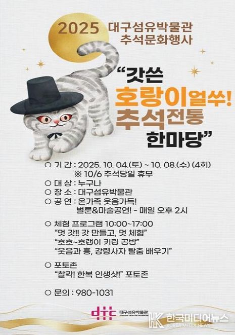 [ 한국미디어뉴스 이보영 기자 ] 대구섬유박물관은 10월 4일부터 10월 8일까지(추석 당일 휴관) 추석 문화행사 ‘갓 쓴 호랑이랑 얼쑤!‘를 개최한다.