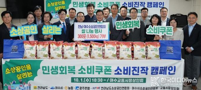 [ 한국미디어뉴스 이종철 기자 ] 전라남도와 전남도 소상공인연합회는 1일 여수 교동시장에서 농협과 광주은행으로부터 기부받은 쌀(5kg) 300포를 활용해 지역민과 함께 나누는 ‘민생회복 소비쿠폰 소비 진작 캠페인’을 개최했다고 밝혔다.