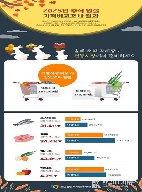 4인 기준 추석 차례상 준비 비용은 전통시장이 298,766원, 대형마트 373,164원으로, 전통시장이 대형마트에 비해 74,398원(19.9%) 저렴하며, 전체 27개 조사 품목 중 20개 품목이 전통시장에서 더 저렴한 것으로 조사됐다.