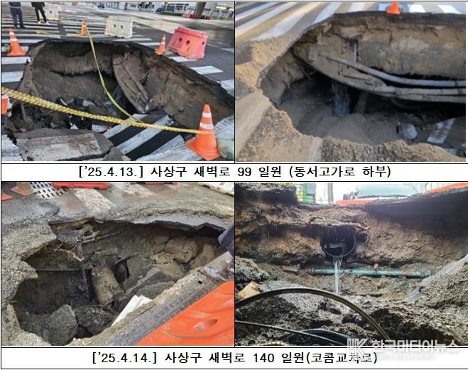 ▲4월 13일 사고지점인 동서고가로 하부에서는 우수박스 측벽을 관통한 폐관다발이 절단된 채 존치돼 있어 관통부를 통해 지속적인 누수가 있었을 것으로 보이며, ▲4월 14일 사고지점인 코콤교차로에서는 소형 땅꺼짐으로 인해 하수관이 내려앉으며 파손돼 누수가 발생한 것으로 판단된다.