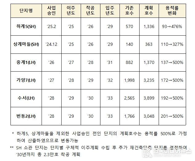 이어서 단지별 이주대책 마련 후, ’28년 중계1단지, ’29년 가양7, ’30년 수서·번동2 등 총 2.3만호 규모의 재건축을 순차적으로 착공할 예정이다.