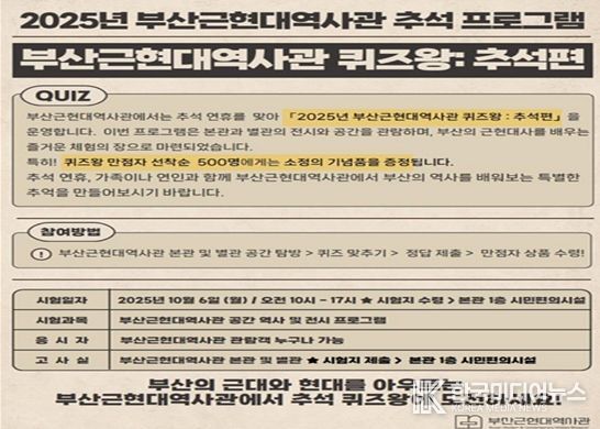 부산근현대역사관은 추석 연휴를 맞아 오는 10월 6일 오전 10시부터 오후 5시까지 시민참여 프로그램 '2025년 부산근현대역사관 퀴즈왕: 추석날편'을 운영한다고 밝혔다.