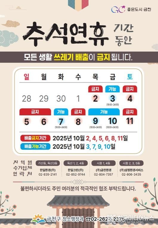 [ 한국미디어뉴스 이보영 기자 ] 금천구는 추석 연휴 기간 생활쓰레기(일반생활쓰레기, 음식물쓰레기, 재활용품) 수거를 일시 중단한다고 밝혔다.