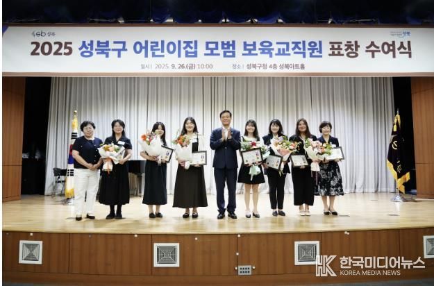 [ 한국미디어뉴스 이보영 기자 ] 서울 성북구가 지난 26일 관내 어린이집에서 장기간 근무하며 보육서비스 향상과 우수 보육프로그램 개발, 보육환경 개선에 기여한 모범 보육교직원에게 표창을 수여했다. 올해 수상자는 원장, 보육교사, 조리사 등 총 77명으로, 각자의 자리에서 아이들의 안전과 건강, 교육의 질 향상에 힘써온 공로를 인정받았다.