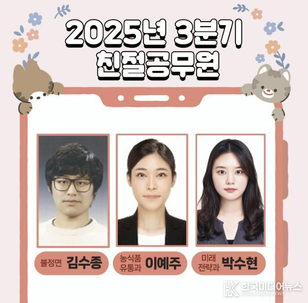 [ 한국미디어뉴스 김풍옥 기자 ] 충북 괴산군은 2025년 3분기 친절공무원으로 김수종 주무관(불정면사무소), 이예주 주무관(농식품유통과), 박수현 주무관(미래전략과)을 선정했다고 밝혔다.