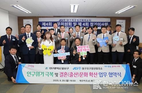 [ 한국미디어뉴스 이보영 기자 ] 대구 달서구는 지난 29일 대구지구청년회의소(회장 이성범)와 초저출생 인구 위기 극복 및 긍정적 결혼문화 확산을 위한 업무협약을 체결했다.