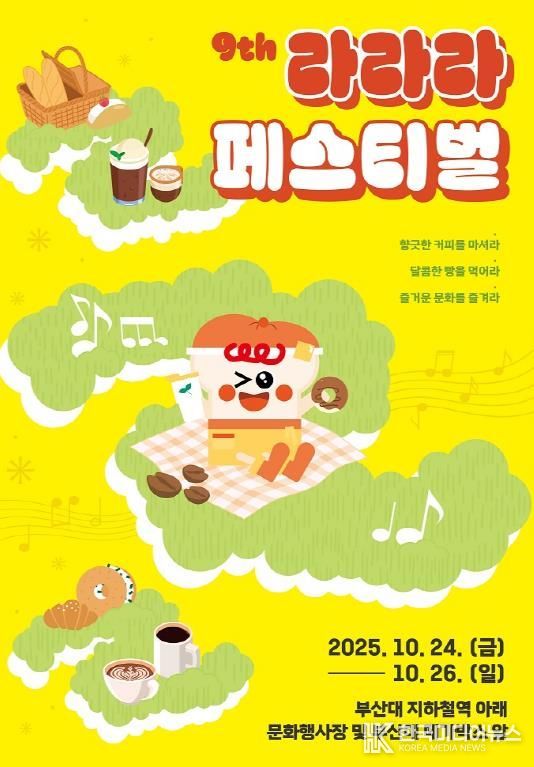 [ 한국미디어뉴스 이원영 기자 ] 부산시 금정구는 “일상의 즐거움을 부르다”를 주제로 한 제9회 라라라 페스티벌이 오는 10월 24일부터 26일까지 부산대 지하철역 아래 온천천 문화행사장과 부산대 메가박스 앞 일원에서 열린다고 2일 밝혔다.