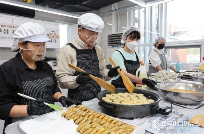 김찬진 청장과 자원봉사자들이 만든 전 3종 세트(동그랑땡, 동태전, 오색꼬지전)와 사랑의 쿠키 꾸러미는 지역 내 취약계층 110가구에 전달됐다.