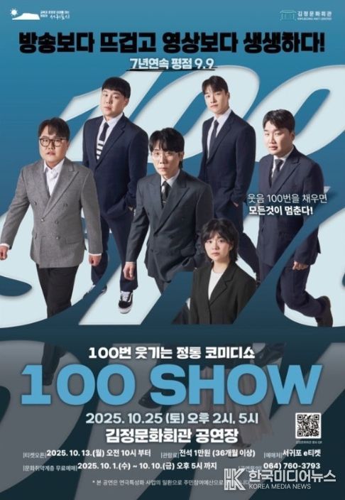 [ 한국미디어뉴스 이원영 기자 ] 서귀포시는 2025년 연극특성화사업의 마지막 공연으로, 전통적인 연극의 틀을 깨고 관객과 실시간으로 소통하는 신개념 코미디 연극 '100 SHOW'를 오는 10월 25일 오후 2시와 5시, 총 2회에 걸쳐 김정문화회관 공연장에서 선보인다.