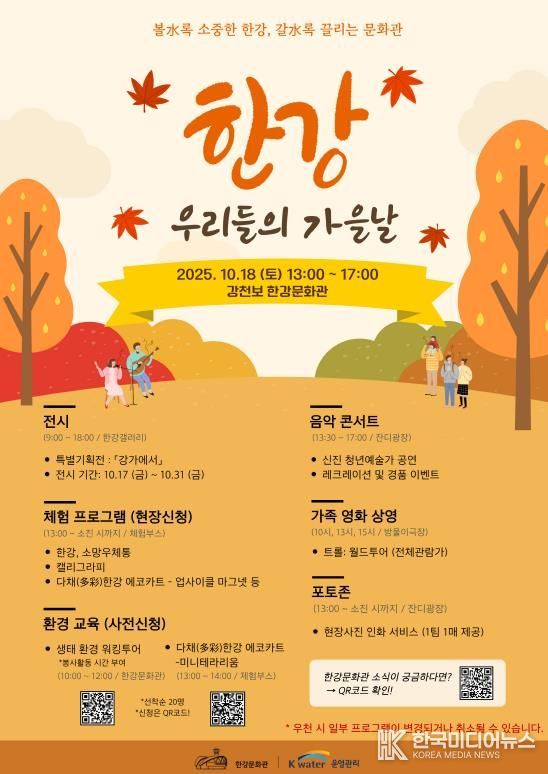 [ 한국미디어뉴스 이보영 기자 ] K-water한강보관리단과 케이워터운영관리 한강문화관은 오는 10월 18일 가족과 이웃이 함께 즐기는 대표 문화축제 “한강, 우리들의 가을날”를 개최한다고 밝혔다