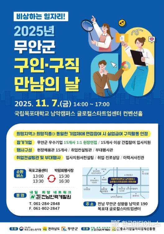 [ 한국미디어뉴스 이종철 기자 ] 전남 무안군은 오는 11월 7일 목포대학교 남악캠퍼스 글로컬스타트업센터 컨벤션홀에서 개최하는 『2025년 무안군 구인·구직 만남의 날』행사에 참여할 기업을 모집한다.