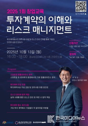 교육은 2025년 10월 13일 충남창업마루나비에서 진행되며, 류재언 변호사(법무법인 율본)가 강사로 참여해 스타트업 컴플라이언스 원칙, 투자계약 주요 조항, 리스크 관리 및 법적 책임, 투자계약 필수 체크사항 등을 상세히 강의할 예정이다.