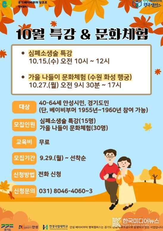 [ 한국미디어뉴스 이보영 기자 ] 안성 베이비부머 행복캠퍼스(한경국립대학교 평생교육원)는 오는 10월 15일부터 27일까지 중장년 안성시민(경기도민)을 대상으로 ‘10월 특강(심폐소생술) 및 문화체험(수원화성행궁)’ 프로그램을 운영한다고 밝혔다.