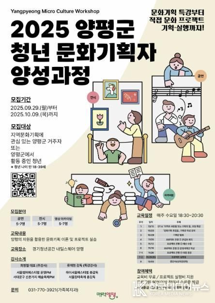 [ 한국미디어뉴스 김서안 기자 ] 양평군은 청년들의 문화·예술 기획 역량 강화를 통해 지역사회 문화 활성화와 청년 일자리 창출을 지원하고자 ‘2025년 양평군 청년 문화기획자 양성과정’을 10월부터 12월까지 운영한다고 밝혔다.