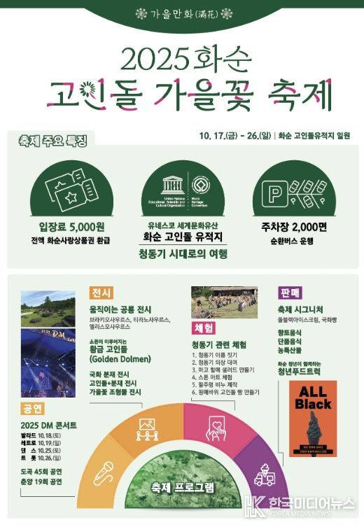 [ 한국미디어뉴스 이종철 기자 ] 전남 화순군)이 오는 10월 17일 ~ 10월 26일까지 10일간 유네스코 세계문화유산인 화순 고인돌 유적지 일대(춘양면 대신리, 도곡면 효산리)에서 '가을만화(滿花)'를 주제로 '2025 화순 고인돌 가을꽃 축제'를 개최한다.