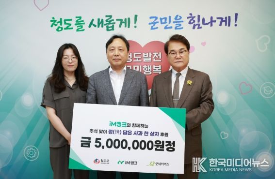 IM뱅크 청도지점 오창용 지점장은 “명절 준비에 어려움을 겪는 이웃들에게 조금이나마 보탬이 되고자 이번 나눔에 동참하게 되었으며, 앞으로도 다양한 사회공헌 활동을 통한 지역사회와 상생의 길을 모색하겠다”고 말했다.