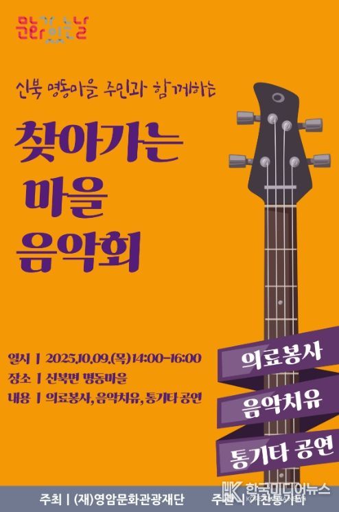 [ 한국미디어뉴스 이종철 기자 ] (재)영암문화관광재단은 2025 문화가 있는 날 행사지원 사업으로 생활문화 동호회인 기찬통기타(대표:최문일)와 함께 신북 명동마을 주민을 대상으로 한 ‘찾아가는 마을 음악회’를 오는 10월 9일 한글날에 개최한다고 밝혔다.