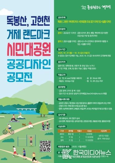 [ 한국미디어뉴스 이원영 기자 ] 거제시는 독봉산·고현천 일대 랜드마크 시민대공원 조성사업의 관심과 공감대를 형성하고, 다양한 아이디어를 반영하기 위하여 독봉산·고현천 거제 랜드마크 시민대공원 공공디자인 공모전을 개최한다.
