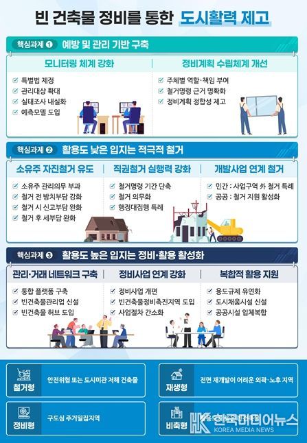 이에, 국토부는 ➊예방 및 관리 기반 구축, ➋활용도 낮은 빈 건축물의 적극적 철거, ➌활용도 높은 빈 건축물의 정비·활용 활성화 등 빈 건축물의 입체적 정비방안을 마련했다.