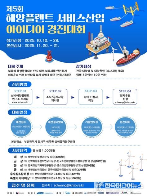 [ 한국미디어뉴스 이원영 기자 ] 해양수산부와 선박해양플랜트연구소(소장 홍기용, KRISO)는 해양플랜트 서비스산업의 미래 혁신을 주도할 청년 인재를 발굴하기 위해 ‘제5회 해양플랜트 서비스산업 아이디어 경진대회’를 개최한다고 밝혔다.