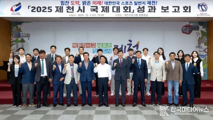 [ 한국미디어뉴스 김풍옥 기자 ] 제천시는 지난 1일 제천시청 5층 청풍호실에서 '2025년 제천시 국제대회'성과보고회를 개최했다. 보고회에는 김창규 제천시장, 박영기 제천시의회 의장, 김경석 대한롤러스포츠연맹 회장(이상 공동조직위원장), 장재돈 대한체조협회 고문과 안성국 제천시체육회장(집행위원장), 오재성 제천시체조협회장, 최호열 제천시롤러스포츠연맹회장(이상 공동 사무총장) 및 유관기관, 단체장 3명과 종목단체 임원 및 회원 50여 명이 참석했다.