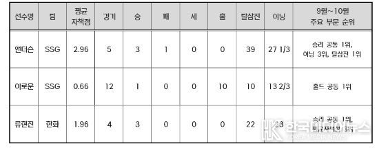 SSG 앤더슨은 9~10월 5경기에 선발 등판해 3승을 거두며 승리 부문 공동 1위에 올랐다. 평균자책점 2.96을 기록했고, 삼진 39개를 잡아내며 탈삼진 부문 월간 1위를 차지했다. 앤더슨은 9~10월 경기 당 평균 8개에 가까운 탈삼진을 잡으며 245탈삼진으로 정규시즌을 마무리했다.
