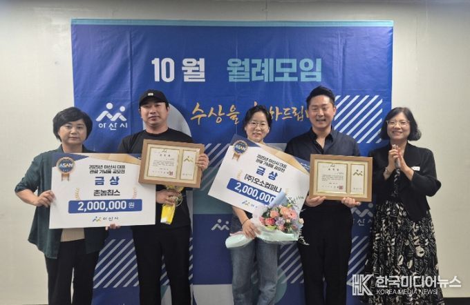 [ 한국미디어뉴스 김서안 기자 ] 아산시는 2일 시청 시민홀에서 열린 10월 월례모임에서 2025 아산시 대표관광기념품 공모전 금상 수상작 2점을 시상했다고 밝혔다.