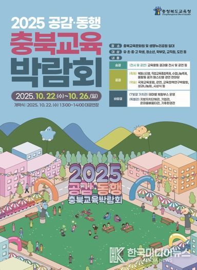 [ 한국미디어뉴스 김풍옥 기자 ] 충청북도교육청은 오는 10월 22일부터 26일까지 5일간 청주시 주중동 소재 교육문화원과 생명누리공원 일대에서 2025 공감‧동행 충북교육박람회를 개최한다고 밝혔다.