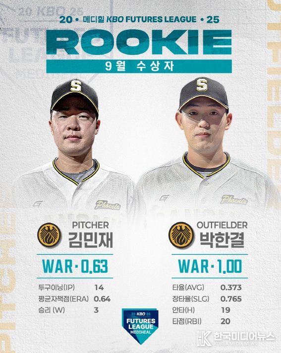 [ 한국미디어뉴스 이원영 기자 ] 2025 메디힐 KBO 퓨처스리그의 9월 퓨처스 루키상 수상자로 투수 부문에는 상무 김민재가 WAR 0.63, 타자 부문에는 상무 박한결이 WAR 1.00을 기록하며 각각 선정됐다.