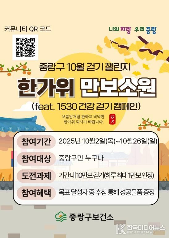 [ 한국미디어뉴스 이보영 기자 ] 중랑구는 모바일 걷기 앱을 활용한 '온라인 걷기 챌린지'를 10월 2일부터 26일까지 25일간 운영한다. 이번 챌린지는 구민들의 일상 속 걷기 실천율을 높이고, 건강한 생활습관을 유도하기 위해 마련됐다.