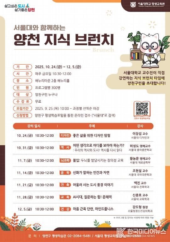 [ 한국미디어뉴스 이보영 기자 ] 양천구는 구민의 인문학적 소양을 넓히고 평생학습 문화를 확산하기 위해 서울대 교수진이 직접 출강하는 고품격 교양 프로그램 ‘양천 지식 브런치’를 오는 10월 말부터 7주간 해누리타운 해누리홀에서 운영한다고 10일 밝혔다.