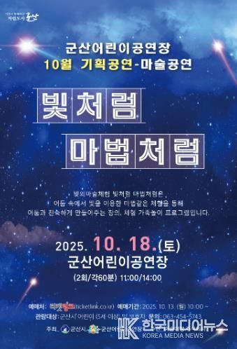 [ 한국미디어뉴스 이종철 기자 ] 군산어린이공연장이 오는 10월 18일 어린이들의 상상력과 창의력을 자극하는 특별한 체험형 공연 '빛처럼 마법처럼'을 선보인다.