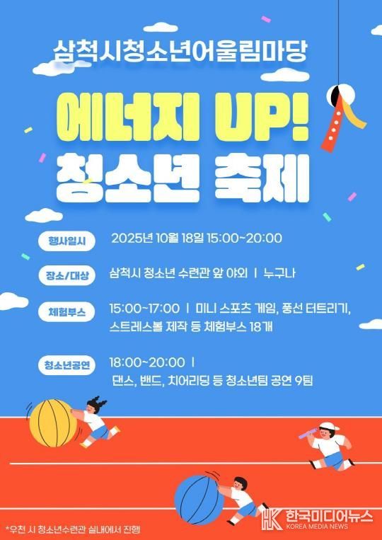 [ 한국미디어뉴스 이원영 기자 ] 삼척시청소년수련관은 오는 10월 18일 오후 3시부터 관내 청소년과 가족을 대상으로 2025 삼척시청소년어울림마당 『에너지 UP! 청소년축제』를 개최한다.