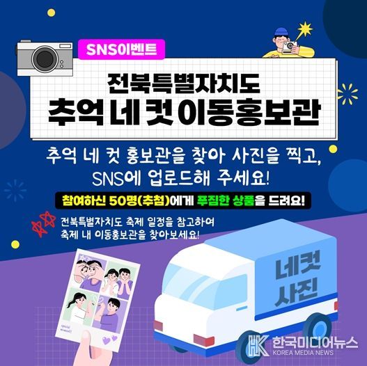 [ 한국미디어뉴스 이종철 기자 ] 전북특별자치도는 10월 10일부터 11월 1일까지 도내 주요 축제 현장에서 ‘추억 네 컷 이동홍보관’을 운영한다고 밝혔다.