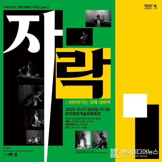 [ 한국미디어뉴스 이종철 기자 ] 전북 완주군에 깊어가는 가을밤, 사라져가는 토속 민요의 숨결을 현대적인 감각으로 재조명하고 재해석한 특별한 국악 공연이 펼쳐진다. 완주문화재단은 오는 10월 17일, 완주향토예술문화회관에서 국악앙상블 불세출의 '자락: 사라져가는 것에 대하여' 공연을 개최한다