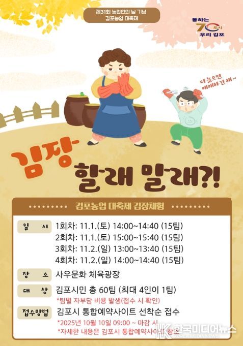 [ 한국미디어뉴스 이원희 기자 ] 김포시는 '제31회 농업인의 날 기념' 김포농업 대축제를 맞아 오는 11월 1일부터 11월 2일까지 시민참여 김장체험 행사를 개최한다.