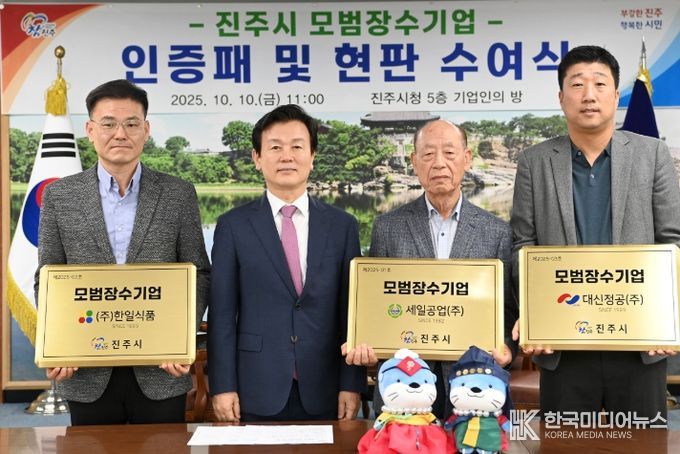 [ 한국미디어뉴스 이원영 기자 ] 진주시는 10일 시청 기업인의 방에서 올해 모범장수기업으로 선정된 세일공업(주), ㈜한일식품, 대신정공(주)에 인증패와 현판을 수여했다.