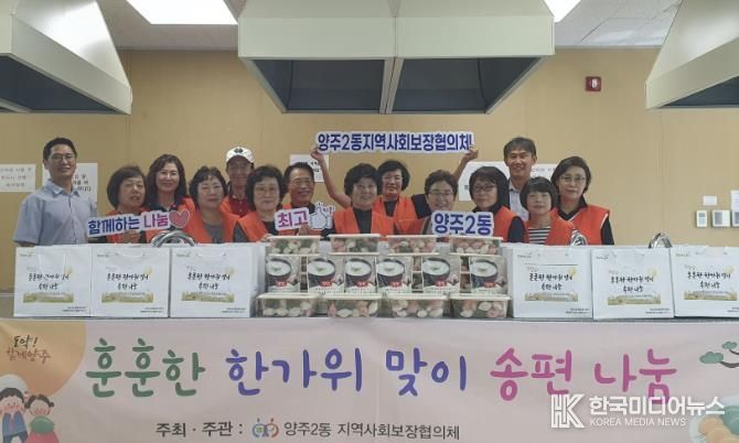 [ 한국미디어뉴스 김서안 기자 ] 양주시 양주2동 지역사회보장협의체가 최근 추석을 맞아 관내 취약계층 100가구를 대상으로 송편을 전달했다.