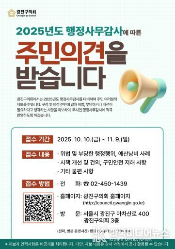 [ 한국미디어뉴스 이원영 기자 ] 광진구의회가 오는 11월 17일부터 진행되는 ‘2025년도 행정사무감사’를 앞두고 주민 의견을 10월 10일부터 11월 9일까지 총 31일간 접수한다.