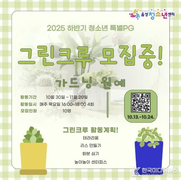 [ 한국미디어뉴스 김풍옥 기자 ] 음성청소년센터는 하반기 청소년 특별 프로그램인 ‘그린크루 모집 중!’을 운영한다고 13일 밝혔다.