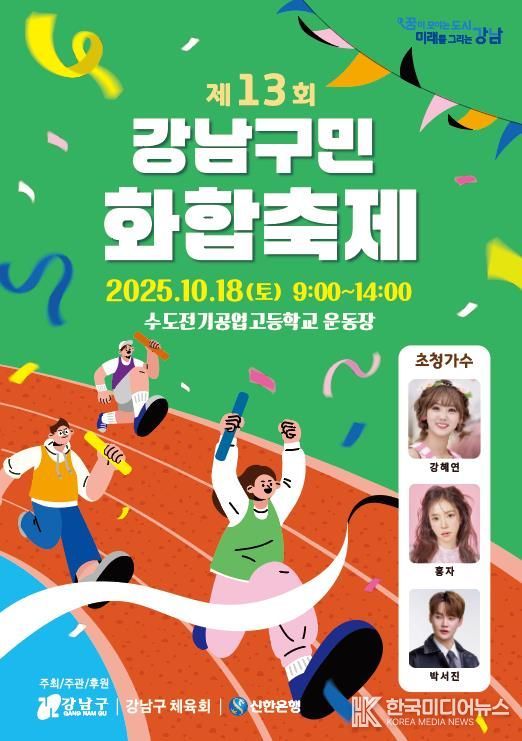 [ 한국미디어뉴스 이보영 기자 ] 꿈이 모이는 도시, 미래를 그리는 강남구가 오는 10월 18일 오전 9시부터 오후 2시까지 수도전기공업고등학교 운동장에서 ‘제13회 강남구민화합축제’를 개최한다. 구민과 선수단 등 약 7,500명이 참여할 예정이며, 소통과 화합을 바탕으로 건강한 지역사회를 만드는 의미 있는 자리가 될 것으로 기대된다.