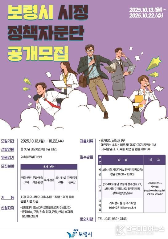 [ 한국미디어뉴스 김서안 기자 ] 보령시는 지역 시정 발전에 대해 조언·권고·건의 등의 자문을 얻고자 보령시 시정 정책자문단 신규 위원을 10월 13일부터 22일까지 10일간 공개 모집한다고 밝혔다.